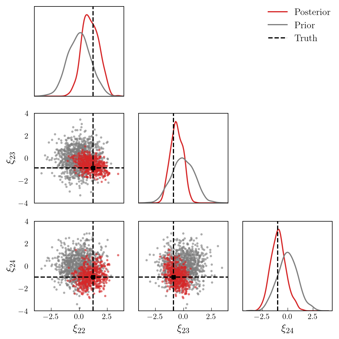 Finally, Figure 4 shows a set of prior and posterior samples for three selected coefficients. It is evident that the posterior is significantly different to the prior.