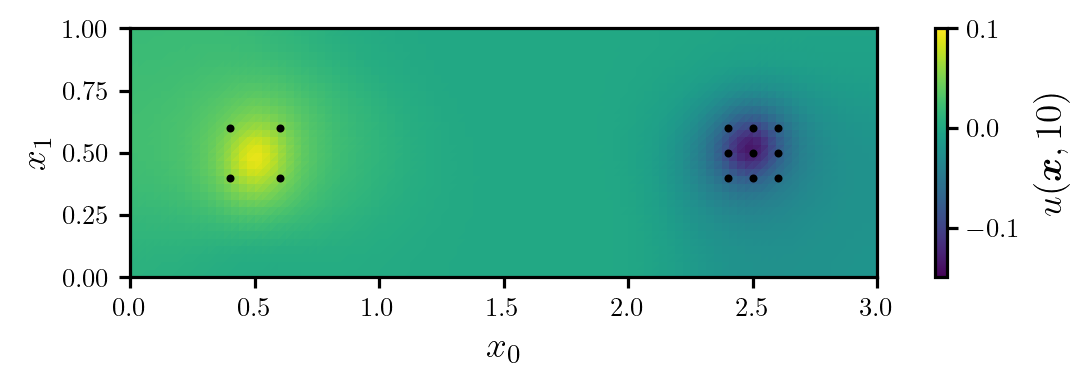 The full model is implemented in FEniCS, on a \(96 \times 32\) grid, using piecwise linear basis functions. Timestepping is done using the backward Euler method. The reduced order model is constructed using the proper orthogonal decomposition (see, e.g., Benner, Gugercin, and Willcox 2015).