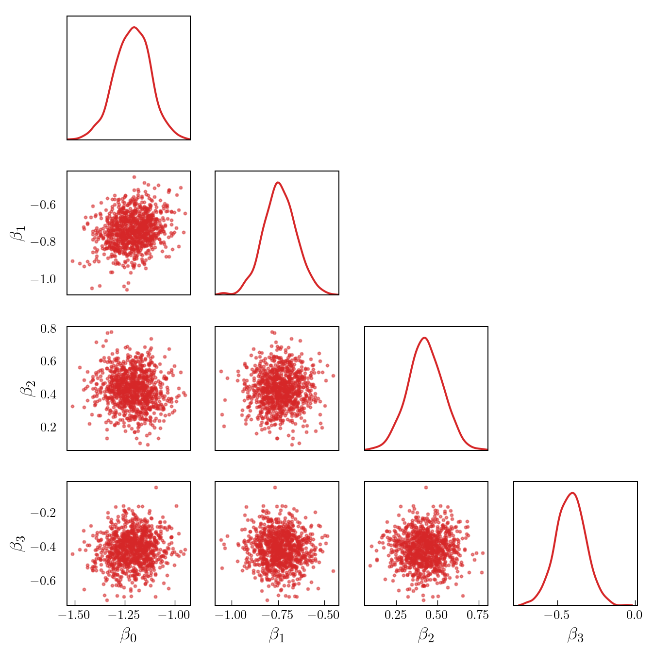 Figure 1 shows a set of samples from the posterior for the first four model parameters (in particular, note that the posterior is highly concentrated relative to the prior).