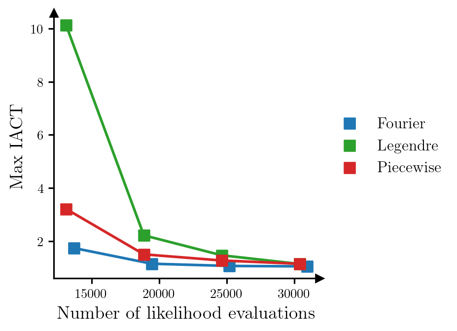 Finally, we show a comparison of different polynomial bases that can be used when constructing the DIRT approximation to the target density. Figure 3 shows the relationship between the number of likelihood evaluations required to construct the DIRT approximation to the posterior, and the maximum IACT of the model parameters for an independence MCMC sampler that uses the DIRT approximation as the proposal density, when bases composed of Fourier, Legendre and piecewise linear polynomials are used. We modify the number of likelihood evaluations used to construct the DIRT approximation by changing the maximum order of the polynomials (Fourier and Legendre polynomials) or the number of linear functions used (piecewise linear polynomials). As before, we construct the DIRT in each case using a single layer.