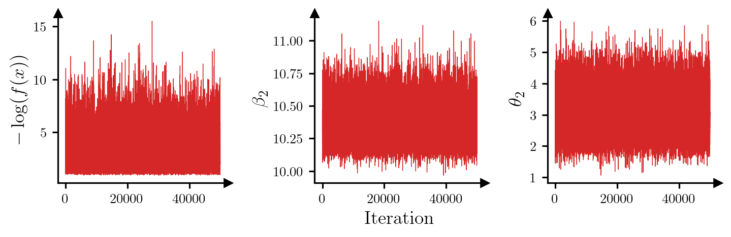 ylabels = [r"$-\log(f(x))$", r"$\beta_{2}$", r"$\theta_{2}$"]